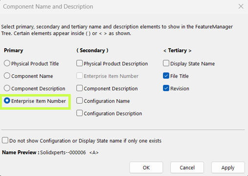 In SOLIDWORKS, you can customize your design tree display to show the EIN instead of the title or even combine it with revision, description, or configuration details.